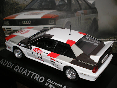 Foi o carro que deu, até hoje, a primeira vitória num rali do mundial a uma mulher, Michelle Mouton (francesa). Quando surgiu no campeonato de 1981 algumas equipas receosas com a sua supremacia reduziram os seus programas de rali, mas o Audi Quattro viria a sofrer alguns problemas de juventude que lhe comprometeram o campeonato, no entanto ficou provado que assim que fossem resolvidos se tornaria num carro quase imbatível e uma referência para as outras marcas. A miniatura do Audi Quattro que apresento é alusiva à primeira vitória de uma mulher, no Rali de San Remo de 1981 pela francesa Michelle Mouton.