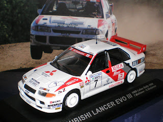 Assim, eis a miniatura do Mitsubishi Lancer Evo III de Tommi Makinen, na versão do Rali dos 1000 Lagos que o finlandês venceu.
