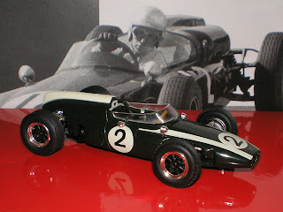As miniaturas apresentadas deste piloto inglês são as seguintes: a moto MV Agusta 500 de quatro cilindros com a qual John Surtees se sagrou Campeão do Mundo de 500 cc em 1956 (da Colecção Grandes Motos de Competição da Altaya), o Cooper T53 de 1961 (Colecção Mitos da F1 da RBA) e o Ferrari 158 do GP de Itália de 1964 (Bruum), ano em que John Surtees venceu o campeonato do mundo de F1. Só para acrescentar refiro que a miniatura da MV Agusta não pertence à minha colecção.